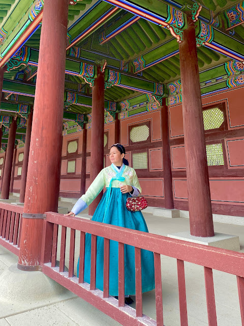 Kami turun di Gyeongbokgung Station (Line 3). Keluar je dari exit 4, kami terus nampak deretan kedai-kedai sewa hanbok. Bersepah-sepah. Sebab dah study area kedai yang kami nak sewa, kami terus ke sana. Voucher sewa hanbok kami beli di Klook. Sampai je di kedai terus scan QR code kat kiosk dan dapat kunci locker. Lepas tu terus pilih hanbok. Pilih hanbok boleh tukar beberapa kali dan diperuntukkan masa 30 minit untuk pilih. Tapi takde lah mereka strict pun. Dah pilih-pilih baju, kami pilih aksesori plak. Ada yang percuma, ada yang kene bayar sewa, tapi tak mahal la. Buat set rambut pun percuma. Tapi masalahnya hair stylistnye mcm slow gile huhuhu.. yang beratur ada beberapa orang. Last-last skip je nak set rambut. Hentam saja laaa